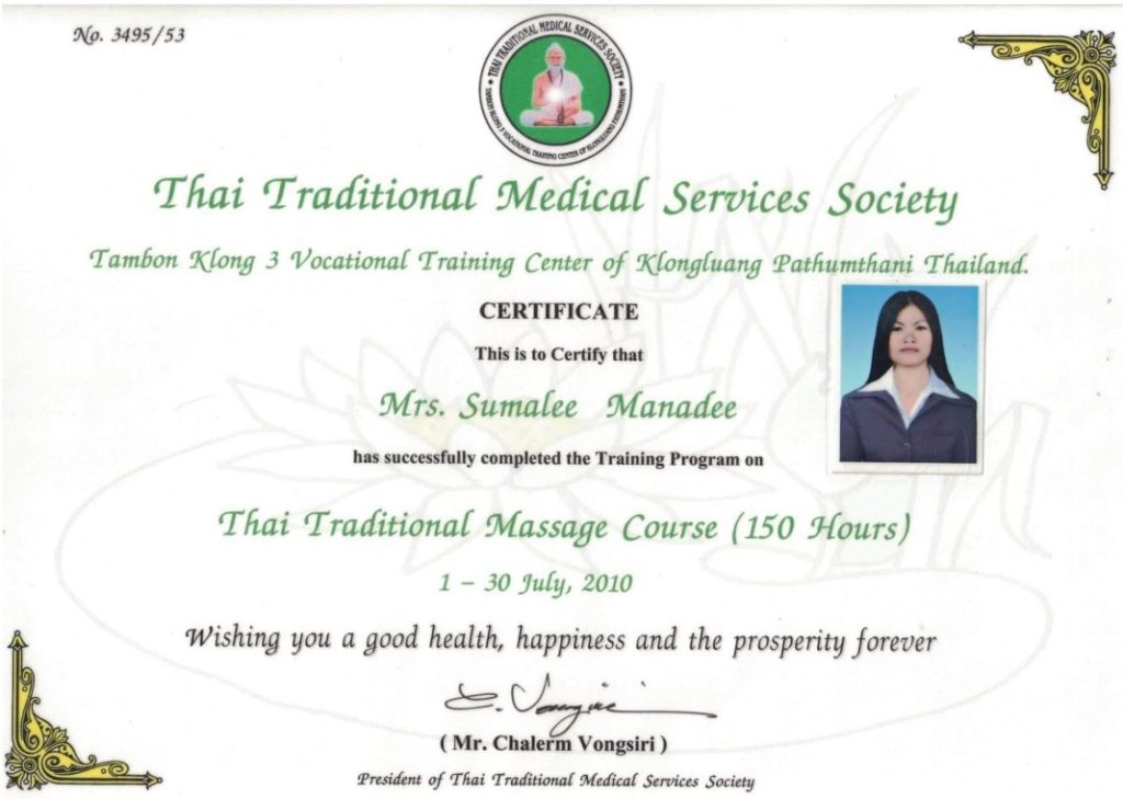 Sumalee er kvinden bag Thale Wellness & Spa og har mere end 1000 timers certificeret uddannelse (se eksempler nederst på denne side) i de mange forskellige typer af Thailansk massage, heriblandt Aroma terapi, Thailandsk Fysiurigsk massage (Traditionel Thaimassage), Dybdegående massageterapi (Sportsmassage) og Herbal ball massage.